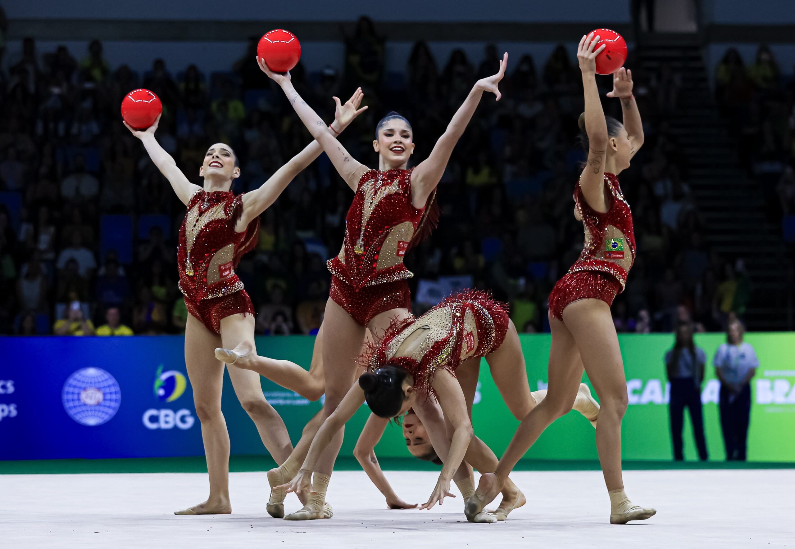 Ao som de Evidências, clássico da música popular brasileira, as ginastas Duda Arakaki, Nicole Pircio, Sofia Madeira, Maria Paula Caminha e Mariana Gonçalves cravaram a apresentação na final de três arcos e duas bolas e ganharam a nota de 28.550, para o delírio do público que lotou a Arena Carioca, no Parque Olímpico, na Barra da Tijuca.