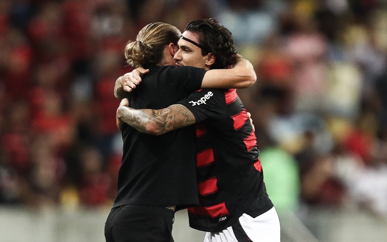 O técnico Filipe Luís comemora com o atacante Pedro | Crédito: X/Flamengo