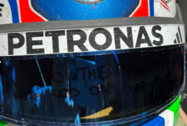 Após a corrida, o italiano de 19 anos assinou a viseira do capacete e fez uma dedicatória: “Para a família Senna com muito amor”, escreveu Antonelli, que usa o número 12 em seu carro em homenagem ao ídolo brasileiro.