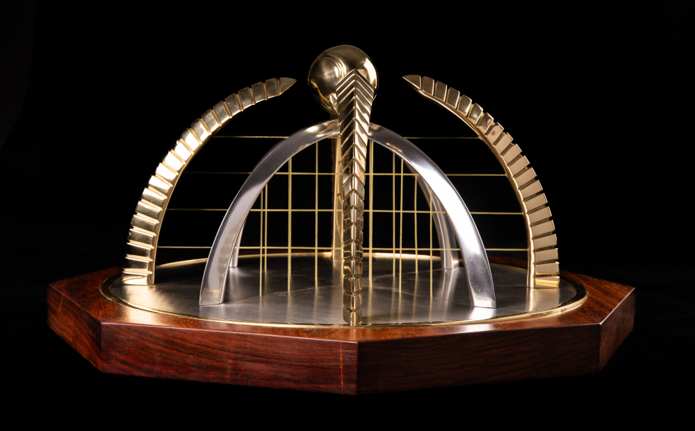 Com 53 centímetros de largura por 53cm de comprimento e 25cm de altura, o troféu pesa cerca de dez quilos Montado manualmente, peça a peça, ele revela em cada ângulo uma nova camada de intenção. O design reflete a sensibilidade da criação e a energia do jogo, combinando tensão, fluidez e presença em um único gesto tridimensional.
